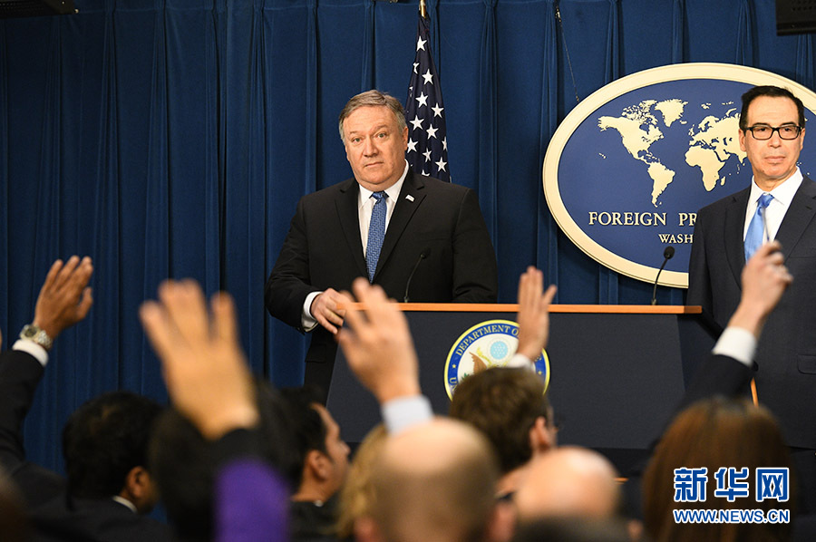 11月5日,在美國首都華盛頓,美國國務(wù)卿蓬佩奧(后左)和財(cái)政部長姆努欽(后右)出席記者會。 新華社記者劉杰攝