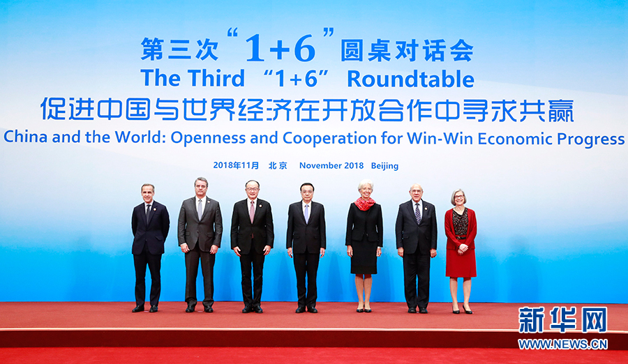 新華社北京11月6日電(記者鄭明達)國務院總理李克強6日下午在釣魚臺國賓館同世界銀行行長金墉、國際貨幣基金組織總裁拉加德、世界貿(mào)易組織總干事阿澤維多、經(jīng)濟合作與發(fā)展組織秘書長古里亞、金融穩(wěn)定理事會主席卡尼和國際勞工組織副總干事格林菲爾德舉行第三次“1+6”圓桌對話會。會議圍繞“促進中國與世界經(jīng)濟在開放合作中尋求共贏”的主題,就當前世界經(jīng)濟走勢、維護多邊貿(mào)易體制等議題深入交流。