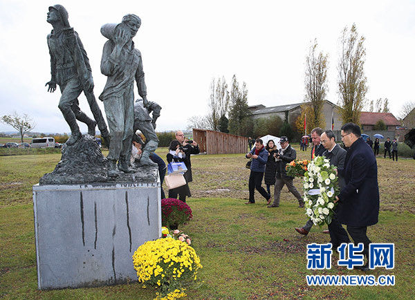 11月10日,在在比利時(shí)西佛蘭德省波珀靈厄市華工雕像園,中國駐比利時(shí)大使曹忠明(右二)、波珀靈厄市市長克里斯托弗·德雅蓋(右三)等向華工雕像敬獻(xiàn)花圈。 新華社記者 葉平凡 攝