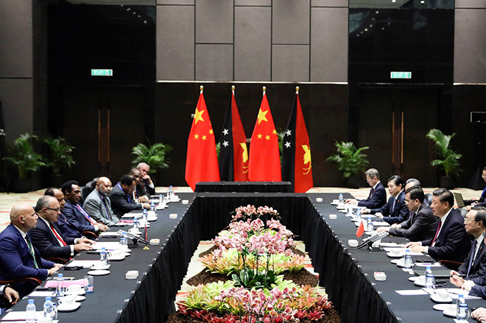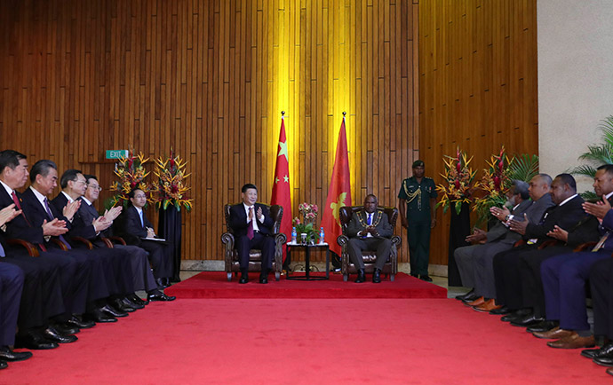 11月16日,國家主席習(xí)近平在莫爾茲比港分別會見建交太平洋島國領(lǐng)導(dǎo)人。這是習(xí)近平會見紐??偫硭P氯A社記者 丁林 攝