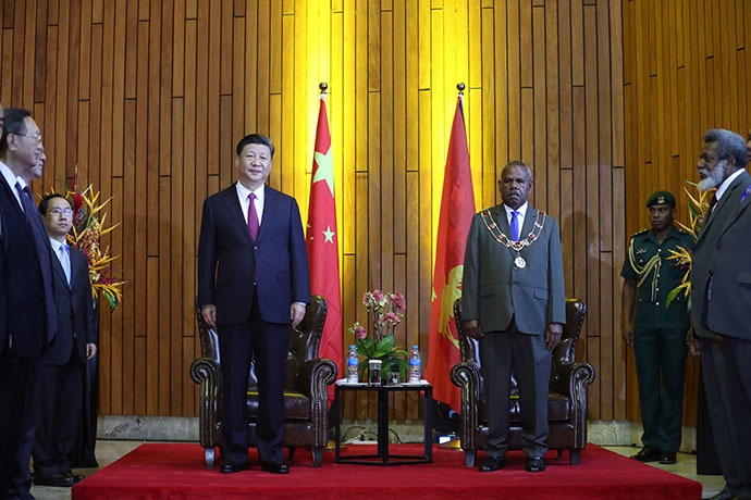 11月16日,國家主席習(xí)近平在莫爾茲比港同巴布亞新幾內(nèi)亞總理奧尼爾、密克羅尼西亞聯(lián)邦總統(tǒng)克里斯琴、薩摩亞總理圖伊拉埃帕、瓦努阿圖總理薩爾瓦伊、庫克群島總理普納、湯加首相波希瓦、紐??偫硭冉ń惶窖髰u國領(lǐng)導(dǎo)人以及斐濟(jì)政府代表、國防部長昆布安博拉舉行集體會晤。習(xí)近平主持會晤并發(fā)表主旨講話。新華社記者 龐興雷 攝