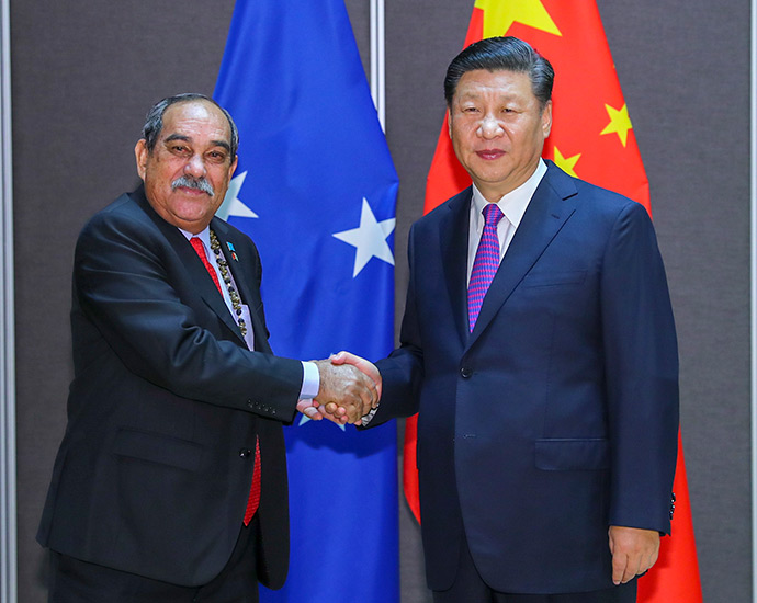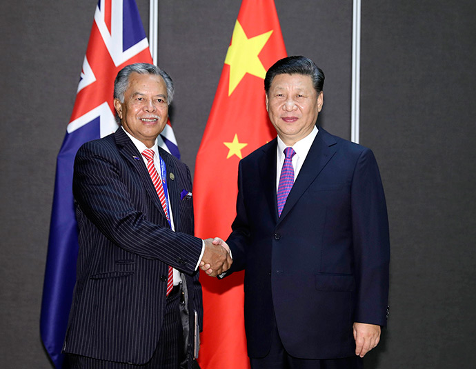 11月16日,國家主席習(xí)近平在莫爾茲比港分別會見建交太平洋島國領(lǐng)導(dǎo)人。這是習(xí)近平會見庫克群島總理普納。新華社記者 丁林 攝