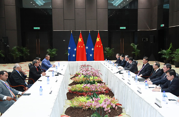 11月16日,國家主席習(xí)近平在莫爾茲比港分別會見建交太平洋島國領(lǐng)導(dǎo)人。這是習(xí)近平會見密克羅尼西亞聯(lián)邦總統(tǒng)克里斯琴。新華社記者 龐興雷 攝