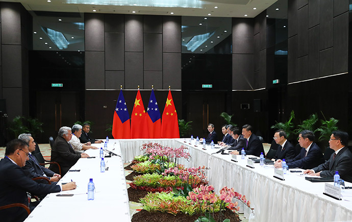 11月16日,國家主席習(xí)近平在莫爾茲比港分別會見建交太平洋島國領(lǐng)導(dǎo)人。這是習(xí)近平會見薩摩亞總理圖伊拉埃帕。新華社記者 謝環(huán)馳 攝