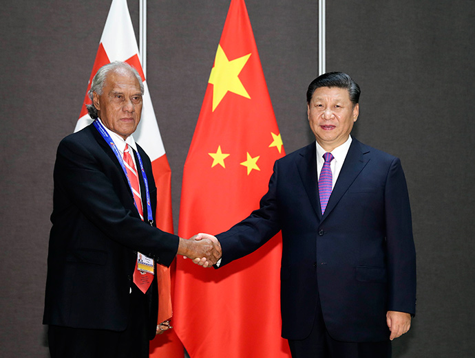 11月16日,國家主席習(xí)近平在莫爾茲比港分別會見建交太平洋島國領(lǐng)導(dǎo)人。這是習(xí)近平會見湯加首相波希瓦。新華社記者 丁林 攝
