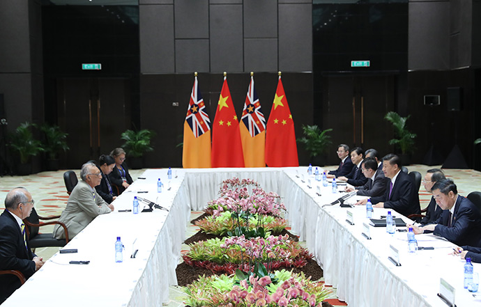 11月16日,國家主席習(xí)近平在莫爾茲比港分別會見建交太平洋島國領(lǐng)導(dǎo)人。這是習(xí)近平會見紐埃總理塔拉吉。新華社記者 丁林 攝