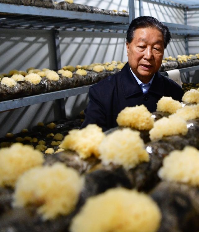 福建農林大學研究員林占熺在查看利用巨菌草碎渣來培育的銀耳。新華社記者 魏培全 攝