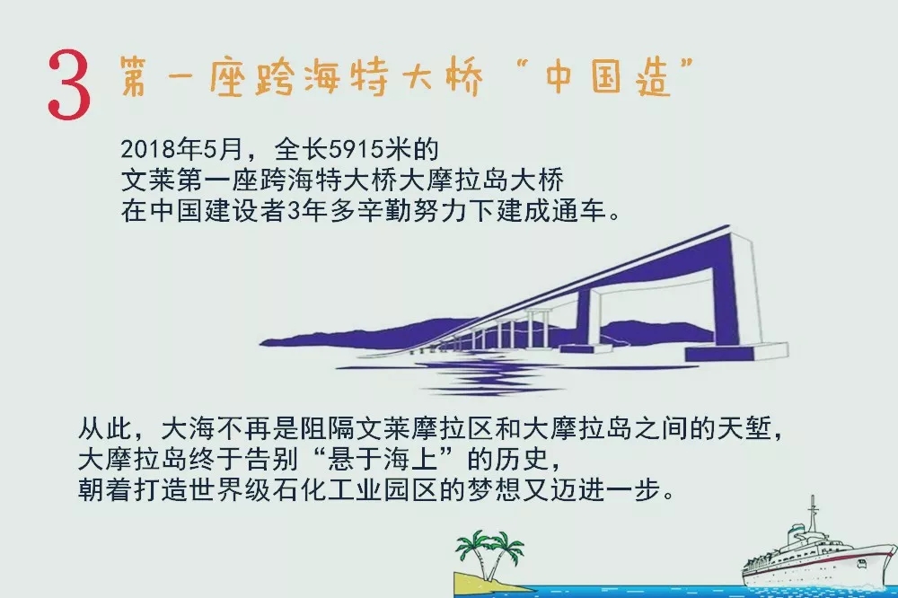 今年5月,全長5915米的文萊第一座跨海特大橋大摩拉島大橋在中國建設者3年多辛勤努力下建成通車。從此,大海不再是阻隔文萊摩拉區(qū)和大摩拉島之間的天塹,大摩拉島終于告別“懸于海上”的歷史,朝著世界級石化工業(yè)園區(qū)的夢想又邁進一步。