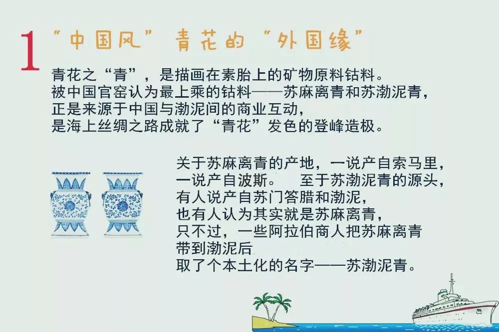 然而,很少有人知道,青花雖是“中國風”,但卻有段“外國緣”。青花之“青”,是描畫在素胎上的礦物原料鈷料。被中國官窯認為最上乘的鈷料——蘇麻離青和蘇渤泥青,正是來源于中國與渤泥間的商業(yè)互動,是海上絲綢之路成就了“青花”發(fā)色的登峰造極。