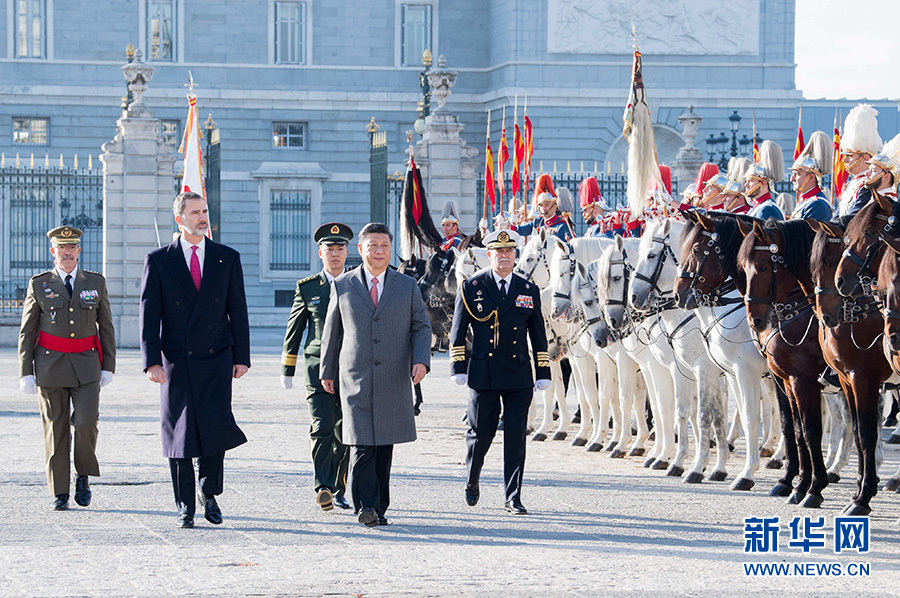 當?shù)貢r間11月28日,國家主席習近平在馬德里出席西班牙國王費利佩六世舉行的隆重、盛大的歡迎儀式。這是習近平在費利佩六世國王陪同下檢閱騎兵方隊。(新華社記者李學仁攝)