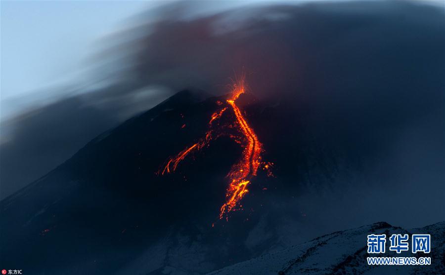 當?shù)貢r間2018年12月8日,意大利西西里島,位于西西里島的東岸活火山埃特納火山再度活躍噴發(fā),熔巖火山灰滾滾噴射。