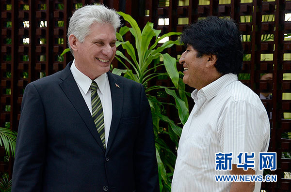 12月14日,在古巴哈瓦那,古巴國務(wù)委員會(huì)主席兼部長會(huì)議主席迪亞斯-卡內(nèi)爾(左)在峰會(huì)開幕前和玻利維亞總統(tǒng)莫拉萊斯交談。 新華社發(fā)(華金·埃爾南德斯 攝)