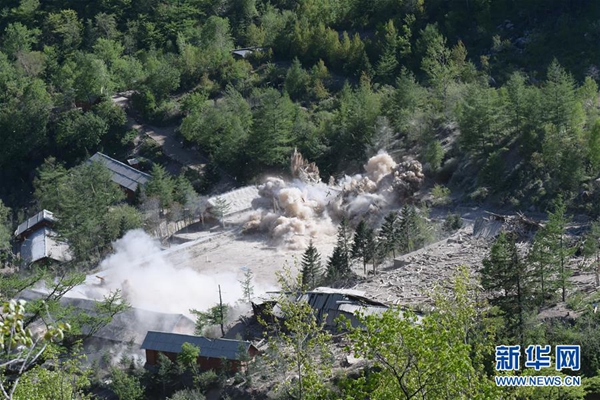 這是5月24日在朝鮮咸鏡北道吉州郡的豐溪里核試驗場拍攝的場內地面建筑爆破場景。朝鮮24日在豐溪里核試驗場對多條坑道和附屬設施進行爆破,并宣布正式廢棄這座核試驗場。 新華社記者 程大雨 攝