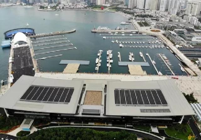 上合青島峰會主會場——青島國際會議中心經(jīng)過短暫的會后內(nèi)部服務功能規(guī)劃調(diào)整正式向游客開放(7月1日無人機拍攝)。新華社記者 李紫恒 攝