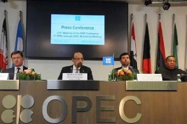 2018年12月7日,在奧地利維也納的石油輸出國組織(歐佩克)總部,俄羅斯能源部長諾瓦克、沙特阿拉伯能源、工業(yè)和礦產(chǎn)大臣法利赫、阿拉伯聯(lián)合酋長國能源部長馬茲魯伊與歐佩克秘書長巴爾金多(從左至右)出席新聞發(fā)布會。當日,石油輸出國組織(歐佩克)與非歐佩克產(chǎn)油國達成協(xié)議,決定從2019年1月開始日均減產(chǎn)原油120萬桶,初步設(shè)定期限為6個月。 新華社記者 劉向 攝