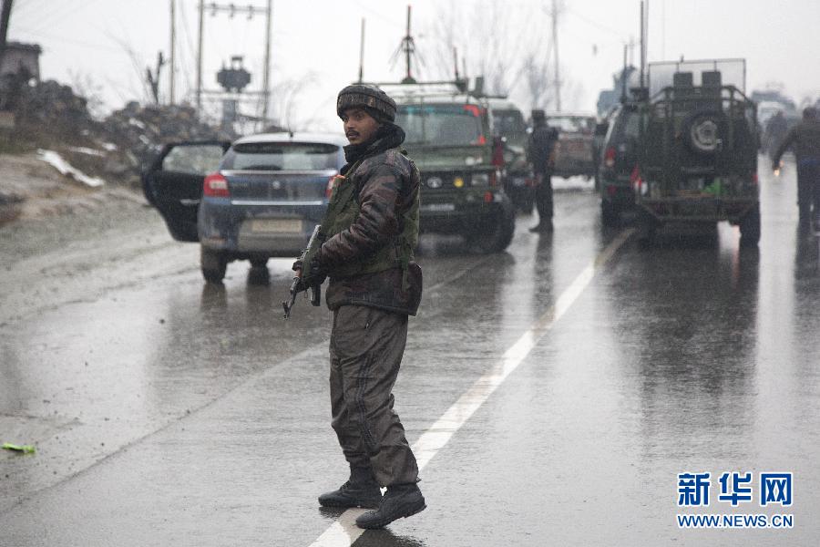 2月14日,在印控克什米爾首府斯利那加以南的普爾瓦馬地區(qū),印度士兵在襲擊現(xiàn)場附近警戒。新華社發(fā)(賈維德·達(dá)爾攝)