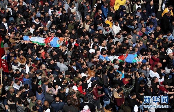 3月20日,在約旦河西岸城市納布盧斯,人們?yōu)楸灰陨胁筷?duì)打死的兩名巴勒斯坦人舉行葬禮。 巴勒斯坦方面證實(shí),以色列部隊(duì)19日晚在約旦河西岸城市納布盧斯和拉姆安拉附近開槍打死3名巴勒斯坦人。 新華社發(fā)(艾曼·努巴尼攝)