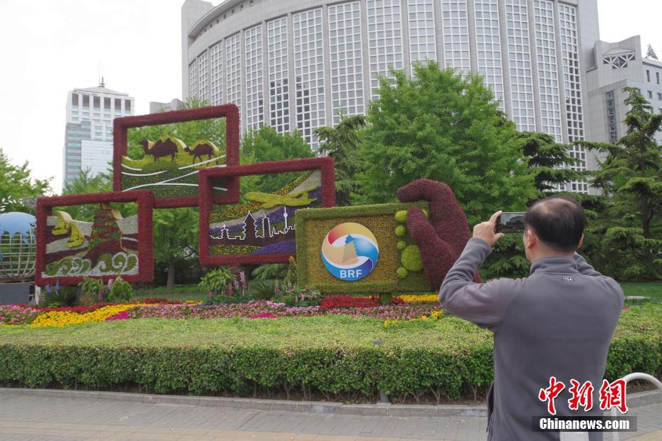 4月18日,北京朝陽門的“一帶一路”主題花壇吸引市民拍照。第二屆“一帶一路”國際合作高峰論壇即將在北京舉行,北京市內布置了多個主題花壇迎接盛會。中新社記者 賈天勇 攝