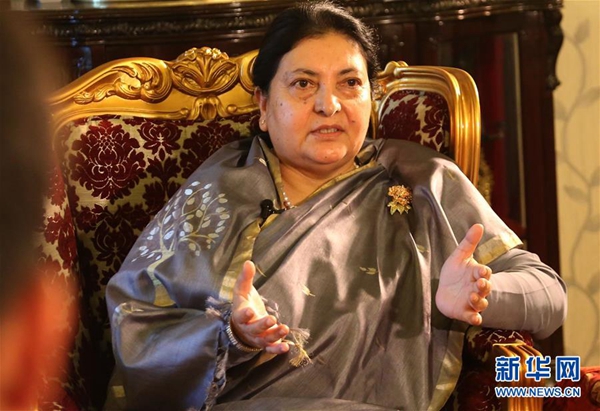 4月18日,在尼泊爾首都加德滿都總統(tǒng)府,尼泊爾總統(tǒng)比迪亞·德維·班達里接受中國媒體記者聯(lián)合采訪。新華社發(fā)(蘇尼爾·夏爾馬 攝)