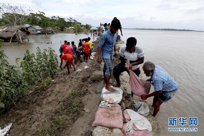 5月4日,在孟加拉國(guó)庫(kù)爾納,人們修補(bǔ)沙袋路堤。新華社發(fā)
