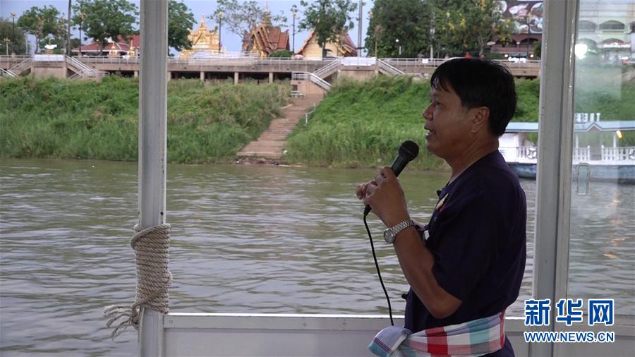 5月8日,在泰國(guó)那空拍儂府,那龍猜在湄公河游船上解說(shuō)。58歲的那龍猜是泰國(guó)那空拍儂府湄公河游船上的志愿解說(shuō)員。新華社記者郭鑫惠攝