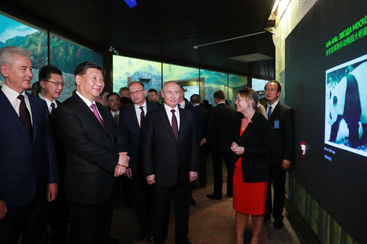 6月5日,國(guó)家主席習(xí)近平在莫斯科克里姆林宮同俄羅斯總統(tǒng)普京會(huì)談。這是會(huì)談后,兩國(guó)元首共同出席莫斯科動(dòng)物園熊貓館開館儀式。新華社記者丁林?jǐn)z