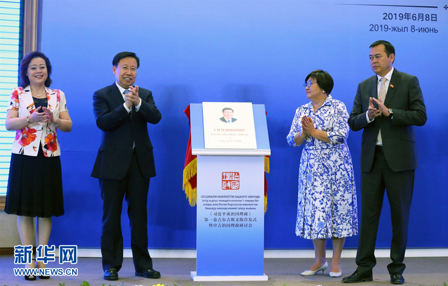 6月8日,在吉爾吉斯斯坦比什凱克,吉爾吉斯斯坦前總統(tǒng)奧通巴耶娃(右二)、吉爾吉斯斯坦議會副議長巴基羅夫(右一)、中宣部常務(wù)副部長王曉暉(左二)和中國駐吉爾吉斯斯坦大使杜德文(左一)共同為《習近平談治國理政》第一卷吉爾吉斯文版新書揭幕。 《習近平談治國理政》第一卷吉爾吉斯文版首發(fā)式暨中吉治國理政研討會6月8日在比什凱克總統(tǒng)官邸舉行。 新華社發(fā)(羅曼攝)