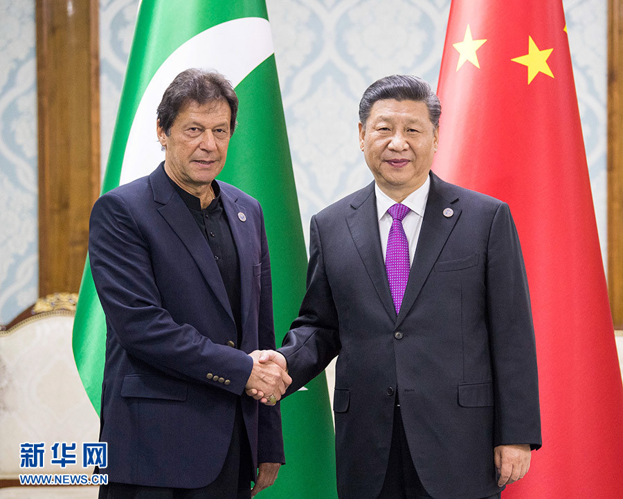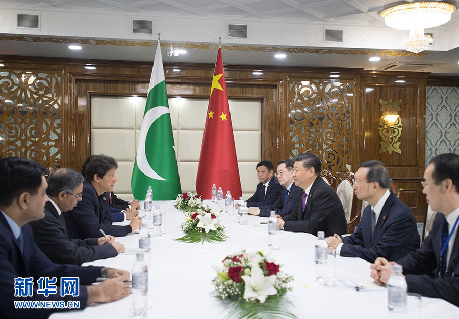 6月14日,國(guó)家主席習(xí)近平在比什凱克會(huì)見巴基斯坦總理伊姆蘭·汗。 新華社記者 李學(xué)仁 攝