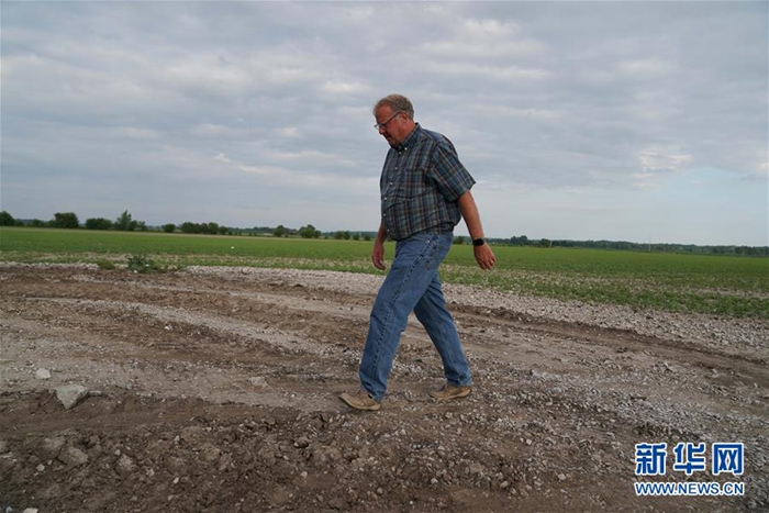 6月9日,在位于美國(guó)中部密蘇里州的小鎮(zhèn)奧里克,湯姆·沃特斯走在自己的農(nóng)田上。新華社記者 劉杰 攝