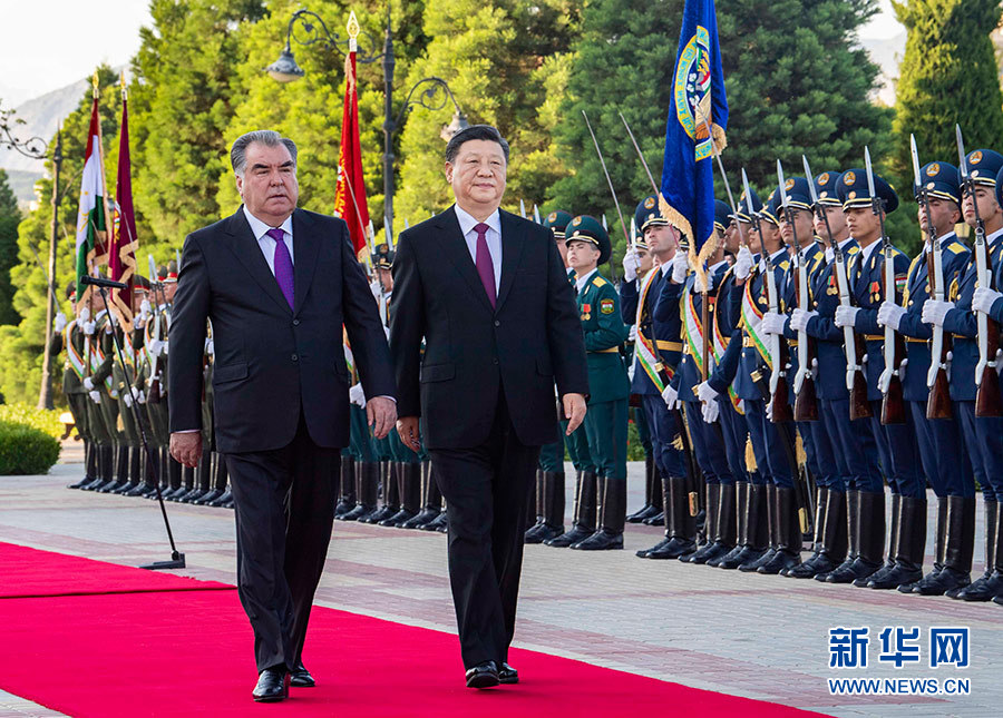 會(huì)談前,拉赫蒙在總統(tǒng)府前廣場(chǎng)為習(xí)近平舉行了盛大歡迎儀式。