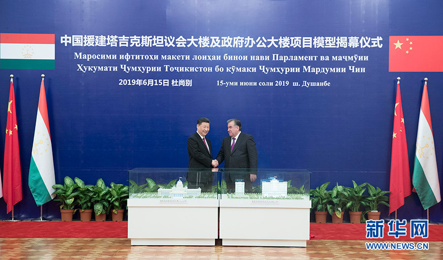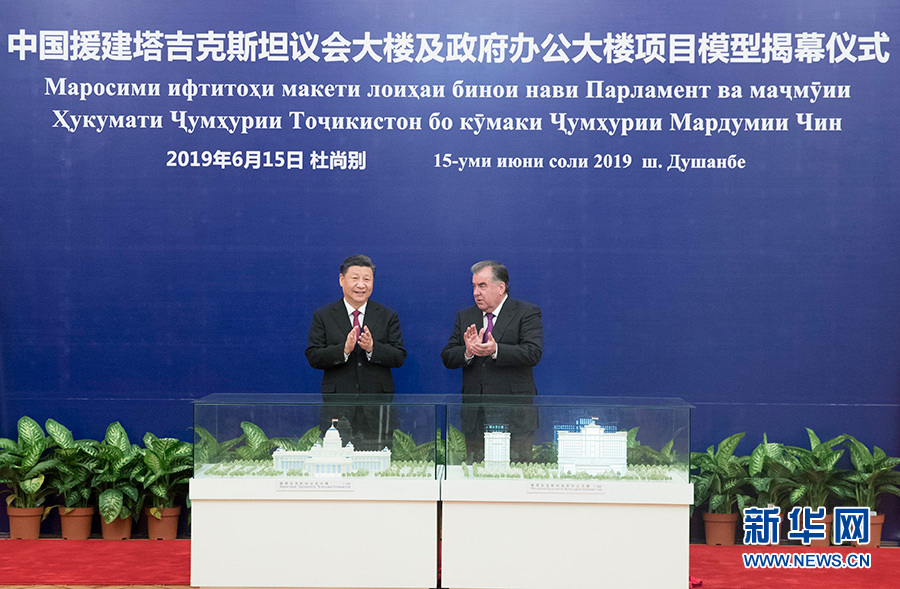 6月15日,國(guó)家主席習(xí)近平在杜尚別同塔吉克斯坦總統(tǒng)拉赫蒙會(huì)談。會(huì)談后,兩國(guó)元首共同出席中方援塔議會(huì)大樓、政府辦公大樓項(xiàng)目模型揭幕儀式。 新華社記者 王曄 攝