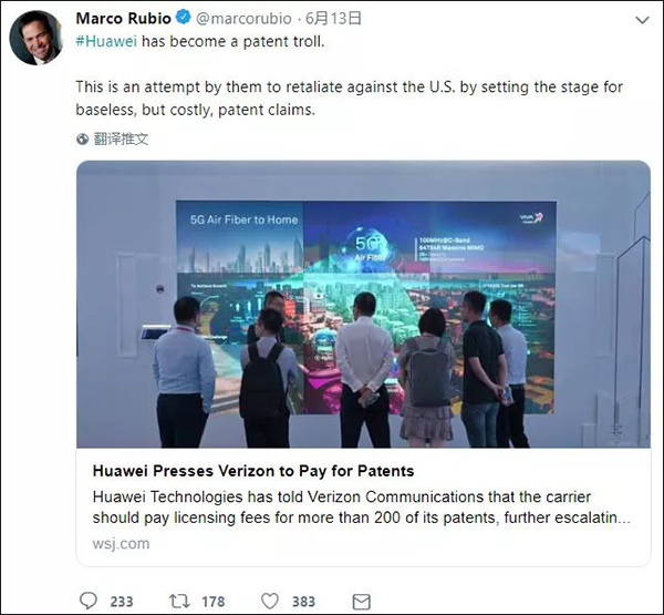 作為美國(guó)反華政客中最激進(jìn)最極端的一個(gè)人,盧比奧多次叫嚷中國(guó)“偷”美國(guó)“知識(shí)產(chǎn)權(quán)”。但是聽(tīng)到這個(gè)消息后,他立馬撤下了那套“捍衛(wèi)者”的偽裝,給合理維權(quán)的華為扣上“專利流氓”的帽子,還宣稱華為的專利都是“沒(méi)有依據(jù)”的。