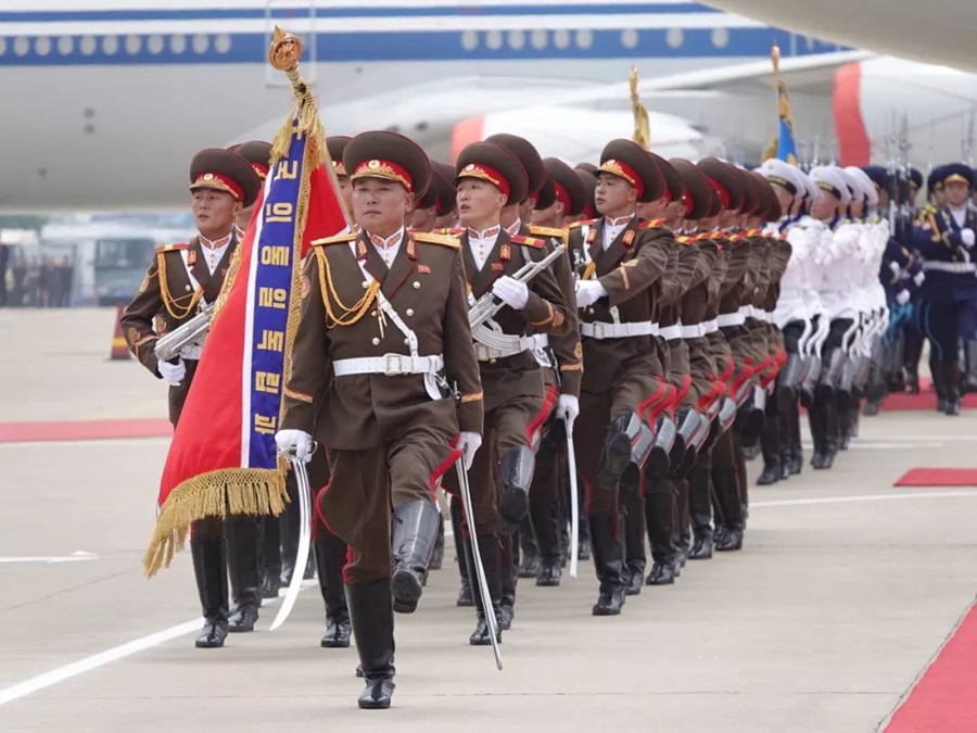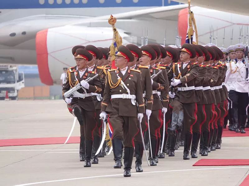 朝方在機(jī)場舉行隆重歡迎儀式。在21響禮炮聲中,軍樂隊奏中朝兩國國歌,習(xí)近平在金正恩陪同下檢閱了朝鮮人民軍三軍儀仗隊,并觀看了分列式表演。
