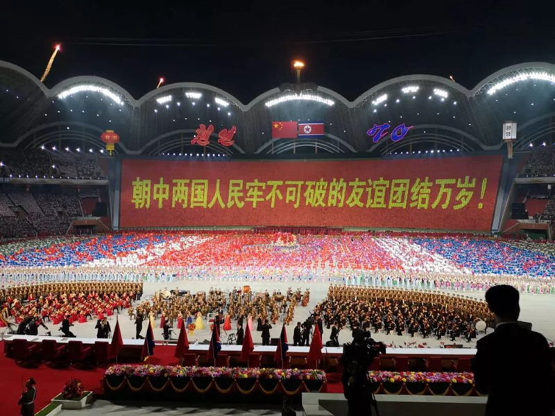 演出在以“朝中友誼萬古長青”為主題的大型歌舞表演中結(jié)束。習(xí)近平和金正恩同全場(chǎng)觀眾一起站立,為藝術(shù)家和演員們的精湛表演送上經(jīng)久不息的掌聲。