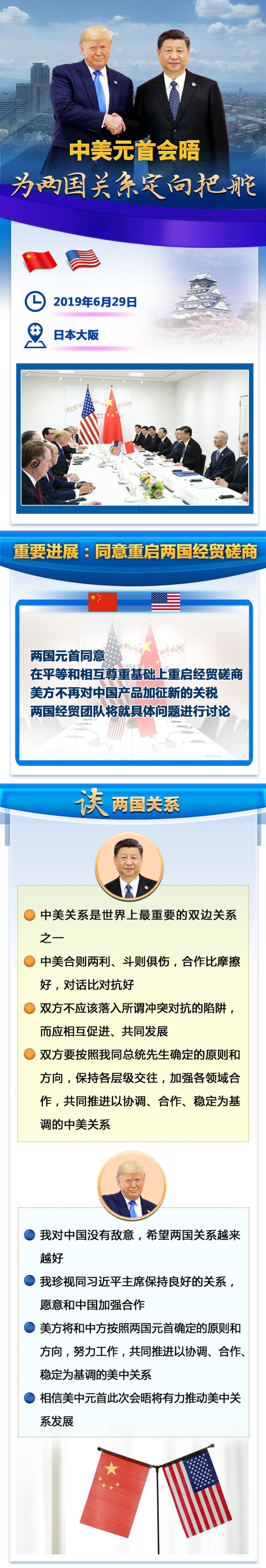 舉世矚目的中美元首會(huì)晤,于6月29日在日本大阪舉行。國(guó)家主席習(xí)近平同美國(guó)總統(tǒng)特朗普就事關(guān)中美關(guān)系發(fā)展的根本性問題、當(dāng)前中美經(jīng)貿(mào)摩擦以及共同關(guān)心的國(guó)際和地區(qū)問題深入交換意見,為下階段兩國(guó)關(guān)系發(fā)展定向把舵,同意推進(jìn)以協(xié)調(diào)、合作、穩(wěn)定為基調(diào)的中美關(guān)系。