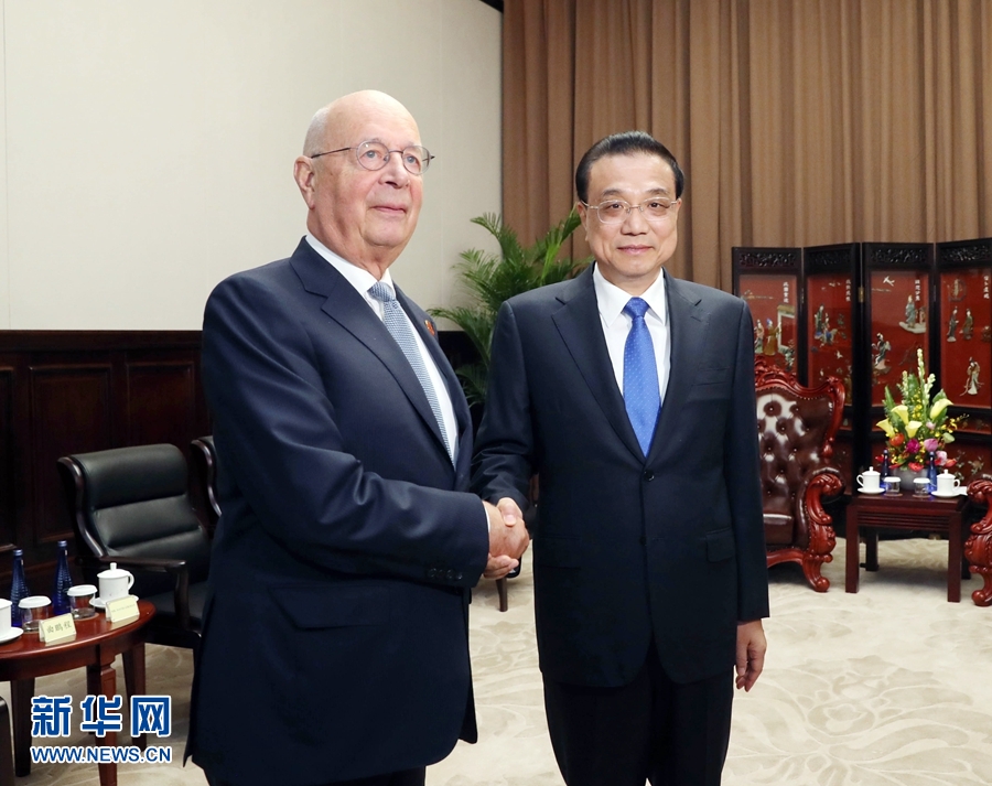 7月1日,國務(wù)院總理李克強(qiáng)在大連會見世界經(jīng)濟(jì)論壇主席施瓦布。 新華社記者 劉衛(wèi)兵 攝