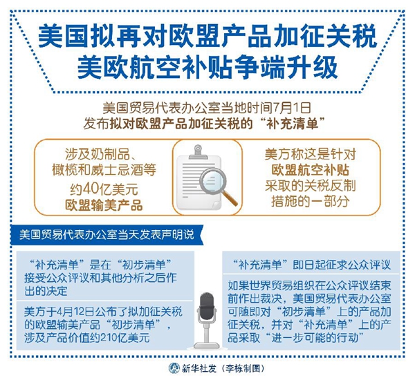 美國貿(mào)易代表辦公室當天發(fā)表聲明說,“補充清單”是在“初步清單”接受公眾評議和其他分析之后作出的決定。美方于4月12日公布了擬加征關(guān)稅的歐盟輸美產(chǎn)品“初步清單”,涉及產(chǎn)品價值約210億美元。