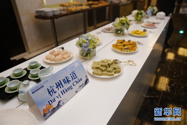 這是7月3日在越南首都河內(nèi)拍攝的推介會上展出的杭州美食。新華社發(fā)(法鑫 攝)