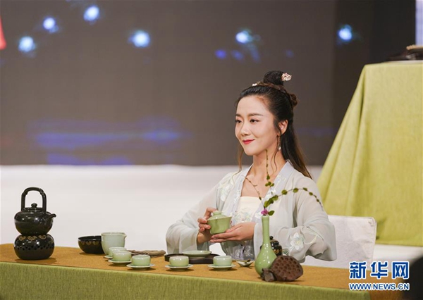 這是7月3日在越南首都河內(nèi)拍攝的推介會上的茶藝表演。新華社發(fā)(法鑫 攝)