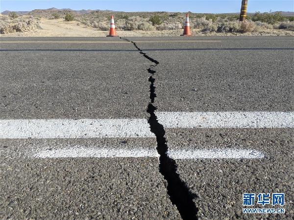 7月6日,在美國加利福尼亞州小鎮(zhèn)特羅納,道路在地震中受損(手機照片)。 美國加利福尼亞州南部地區(qū)4日和5日先后發(fā)生6.4級和7.1級地震,震中和附近地區(qū)遭不同程度破壞。兩次強震震中所在地區(qū)圣貝納迪諾縣已經(jīng)進入緊急狀態(tài)。 新華社記者 檀易曉 攝