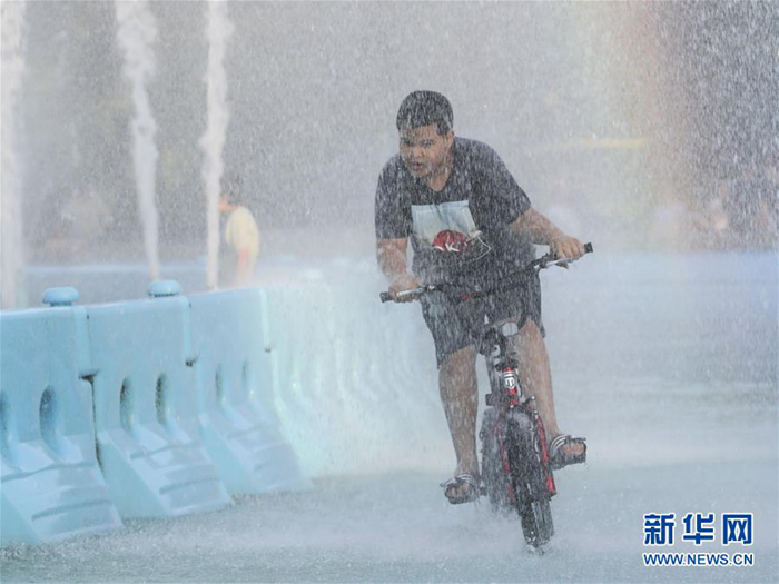 7月9日,在美國(guó)紐約,一名兒童在科羅納公園的噴泉戲水。 夏季來(lái)臨,紐約的噴泉、水池吸引許多民眾戲水消暑。 新華社記者 王迎 攝