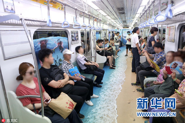 地下交通也得講究涼快。韓國(guó)釜山地鐵就曾設(shè)置了“海灘地鐵”車廂,將沙灘和波浪的美景帶進(jìn)車廂,為炎炎夏日中乘坐地鐵的乘客帶來(lái)一絲清涼。