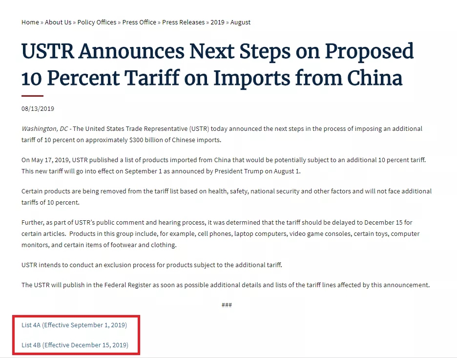 當?shù)貢r間8月13日,美國貿(mào)易代表辦公室(USTR)官網(wǎng)掛出聲明,公布了接下來對中國輸美產(chǎn)品加征關稅的相關計劃。與此前美方聲稱的9月1日生效日期不同的是,部分對華關稅的生效將推遲到12月15日。