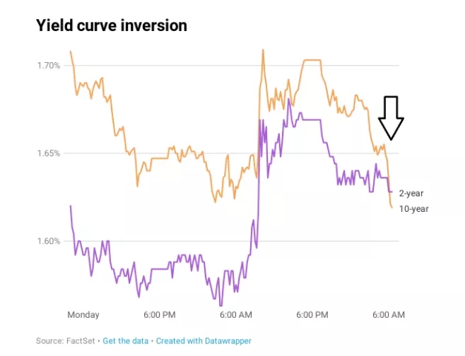 一般說來,國債期限越長收益率越高,因此短期國債收益率通常低于長期國債收益率;如果長期國債收益率降至短期國債收益率以下,這種反?,F(xiàn)象被稱為收益率曲線“倒掛”,一般被視為經(jīng)濟在未來12個月可能步入衰退的預警信號。上次出現(xiàn)這一現(xiàn)象時正值2007年美國次貸危機發(fā)酵。過去50年以來,美國歷次經(jīng)濟衰退發(fā)生之前也都出現(xiàn)過國債收益率倒掛的現(xiàn)象。