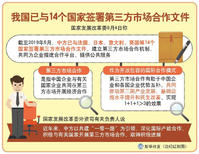 新華社北京9月4日電(記者安蓓)國家發(fā)展改革委4日稱,截至2019年6月,中方已與法國、日本、意大利、英國等14個國家簽署第三方市場合作文件,建立第三方市場合作機制,共同為企業(yè)搭建合作平臺、提供公共服務。