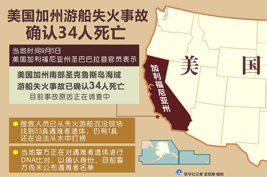 新華社洛杉磯9月5日電(記者譚晶晶 高山)美國加利福尼亞州圣巴巴拉縣官員5日表示,美國加州游船失火事故已確認34人死亡。目前事故原因正在調(diào)查中。