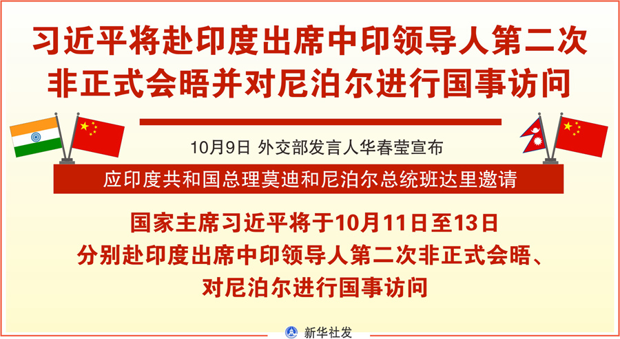 新華社北京10月9日電 外交部發(fā)言人華春瑩9日宣布:應(yīng)印度共和國(guó)總理莫迪和尼泊爾總統(tǒng)班達(dá)里邀請(qǐng),國(guó)家主席習(xí)近平將于10月11日至13日分別赴印度出席中印領(lǐng)導(dǎo)人第二次非正式會(huì)晤、對(duì)尼泊爾進(jìn)行國(guó)事訪問。