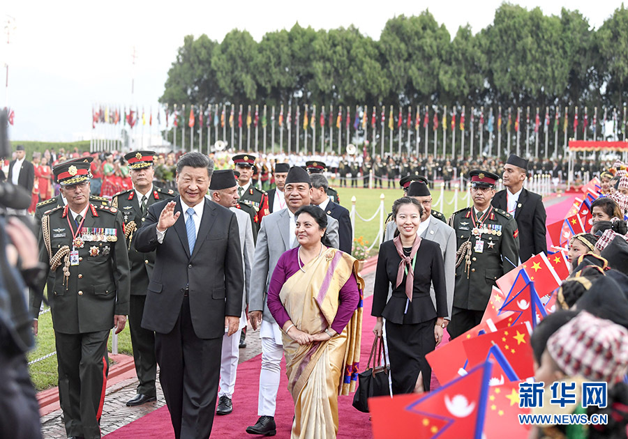 10月12日,國家主席習近平乘專機抵達加德滿都,開始對尼泊爾進行國事訪問。尼泊爾總統(tǒng)班達里在機場為習近平舉行具有濃郁尼泊爾民族特色的歡迎儀式。 新華社記者 高潔 攝