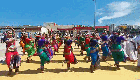 民眾們載歌載舞,有人跳起婆羅多舞,有人踩高蹺、劃旱船,盛情歡迎習主席的到來。