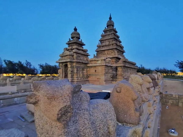 海岸神廟于公元700年至728年間建造,為南印度現(xiàn)存最古老的巖石結構神廟之一。塔型建筑主要用于宗教祭祀。據(jù)傳,海岸最初有七座神廟,但因海岸線變化和海水侵蝕,最終只剩下一座,故此地又名“七塔寺”。新華社記者王曄攝